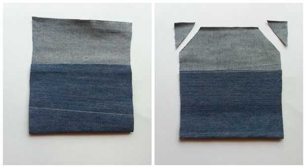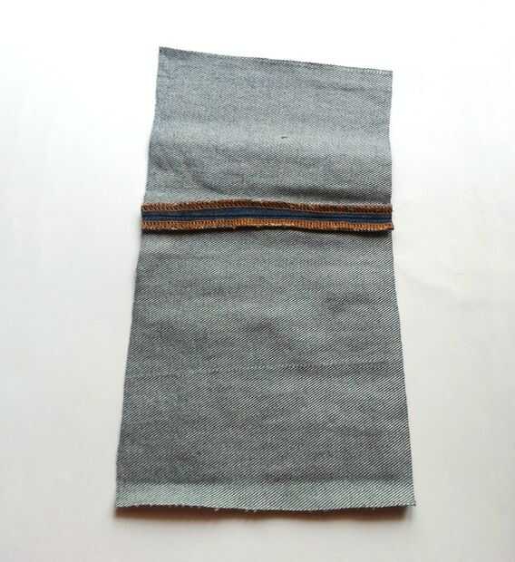 Doble la tela de jean para medir y marcar la bolsa principal y la aleta.