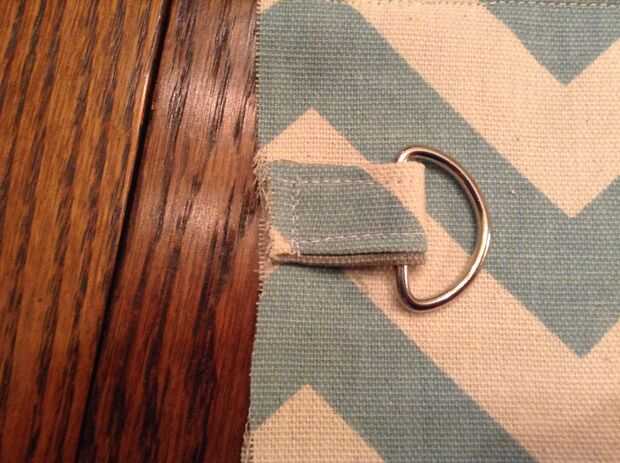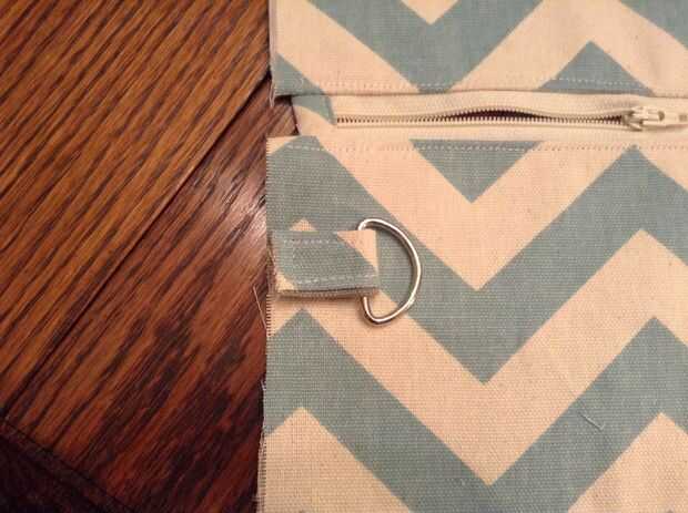 Alinear los bordes crudos de la pestaña del anillo D con el borde lateral de la bolsa de 1/2" abajo de la cremallera en la parte exterior de la bolsa. Un escaso 1/4" desde el borde de la puntada