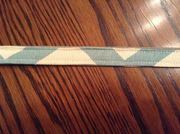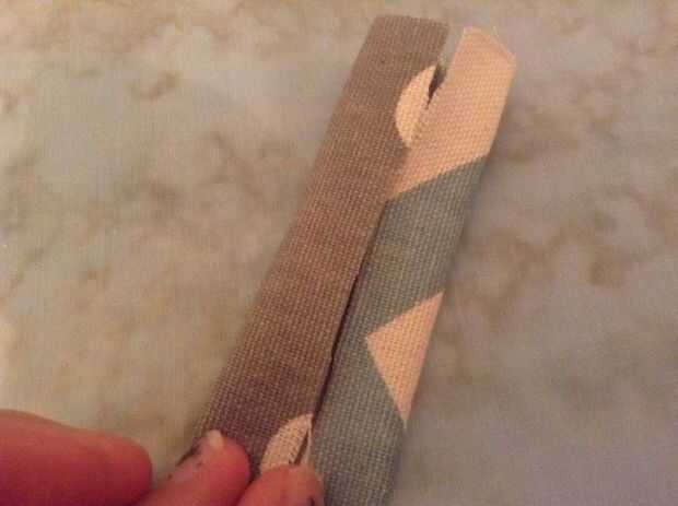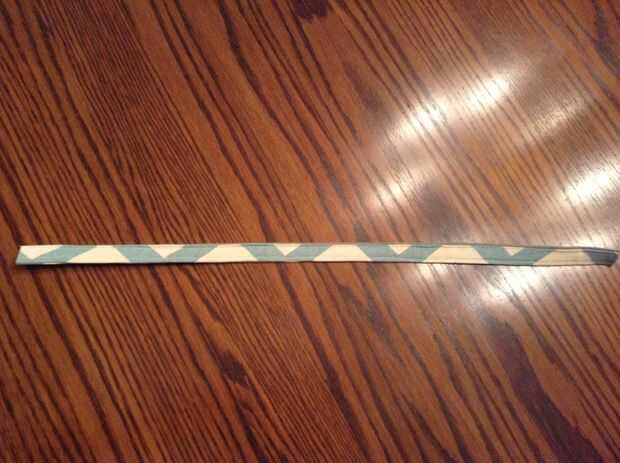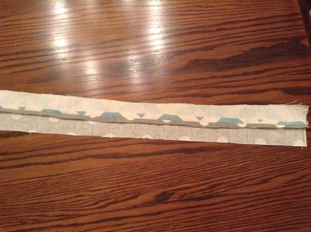 Unir una tira de contraste de 1 3/4 "x 21" a una franja impresa de 1 3/4 "x 21" a lo largo del borde largo derecho con derecho. Utiliza una costura de 1/4. Pulse la costura abierta. Doblar los bordes crudos para quedar al margen y presione. Doblar por la mitad a lo largo de la costura y la prensa. Puntada a lo largo de ambos bordes laterales