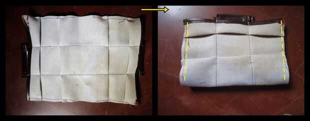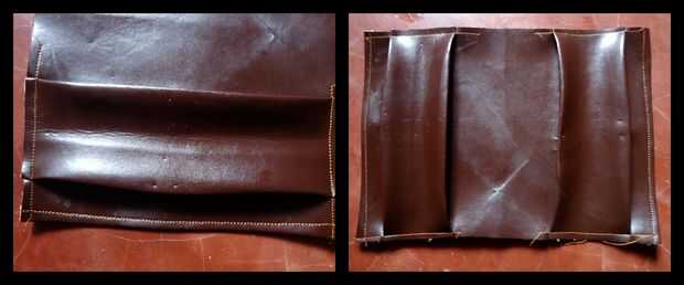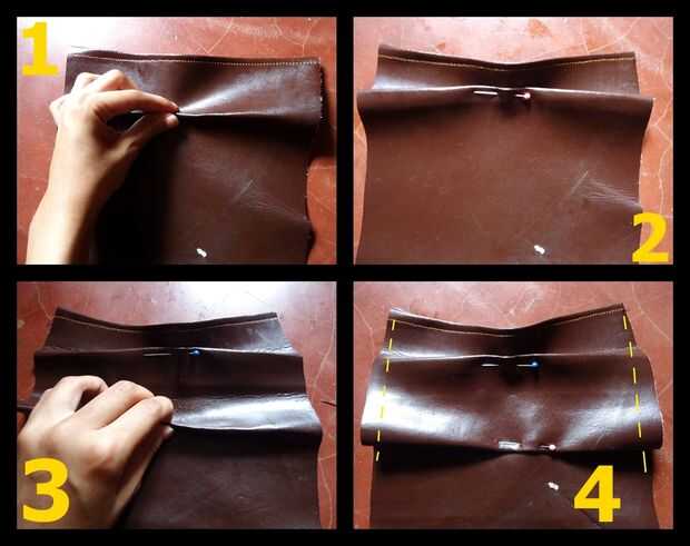 Ahora doblar el cuero (como se muestra en la imagen) y hacer otro doblez, deberían ser pliegues enfrentados, no sé qué son llamaron pero crea un puente.