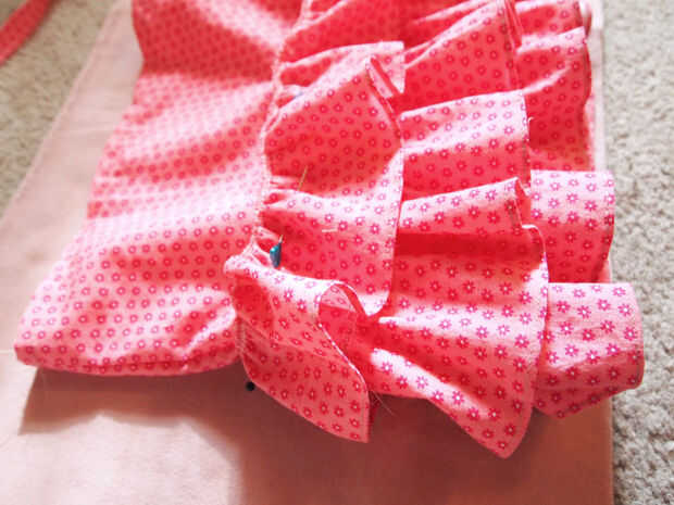 Ahora es el momento para fijar las colmenas a la pieza principal del material. Tomar el volante y encontrar la costura y pin en la parte posterior de la pieza principal de material cerca de la parte inferior. Puesto que la principal pieza de material ya se cose en los bordes, no se puede poner este volante muy próxima a la parte inferior o sobresaliendo demasiado que no será capaces de cosa en que necesite espacio para hacerlo. Por lo tanto, usted puede colocarlo arriba bastante para que quede colgando de la parte inferior de la colmena más allá de la parte inferior de la pieza principal por un poco más. Perno en la pieza principal de material en el frente, parte posterior y dos laterales.