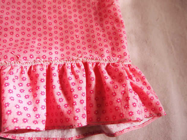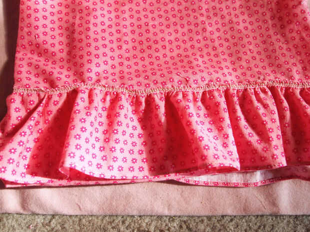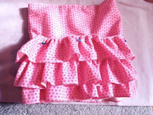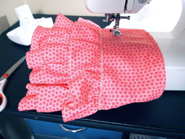 Cosa en con una puntada recta regular en el lado derecho de la tela. Ir lento cuando y tratar de mantener bastante recto. Si no es perfectamente recto, sin embargo, nadie sabrá que será cubierto por más volantes. Hacer lo mismo para las otras colmenas. Colocarlos donde gusta, les pin y coser en.