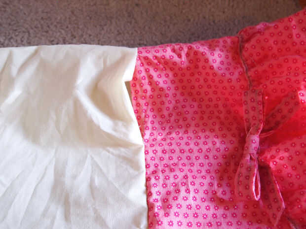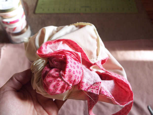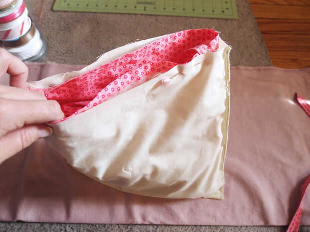 Una vez cosido, use uno de esos agujeros para sacar el material a través de la derecha hacia fuera y verás que en mi foto. Luego empuje el material de revestimiento en la pieza principal.