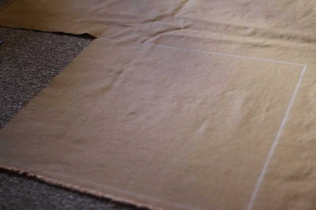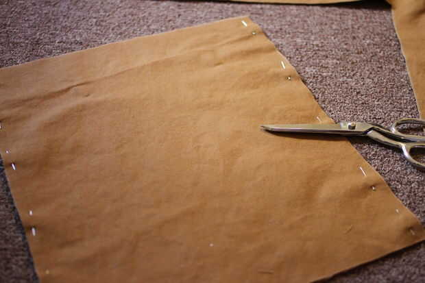 Para cortar a la tela, doblar por la mitad y traza un cuadrado de 16 pulgadas x 14.5 pulgadas con tiza. Corte a lo largo de las marcas de tiza que corta a través ambas mitades de la tela. Prender sólo los lados largos juntos. Mi tela parecía la misma en ambos lados pero si sus lados son diferentes, asegúrese de que el los lados buena se enfrentan hacia adentro cuando usted les pin juntos.
