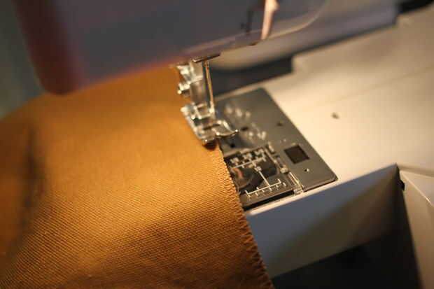 Coser a lo largo de los lados que cubrió, quitando alfileres mientras avanzas. Asegúrese de dejar una en costura de al menos 1/4 de pulgada. Hierro la entrepierna hacia abajo como se muestra en la imagen. Después de un funcionamiento de prueba, empecé a hacer una puntada nublada en todos los bordes "raw" para evitar que se deshilache. Recomiendo que haga lo mismo si su máquina lo permite, especialmente en el borde inferior.