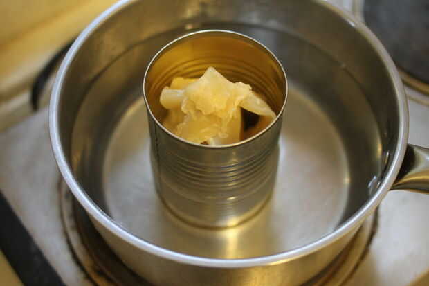 Nota: Por favor use seguridad y sentido común aquí. No toques la cera líquida, no poner una lata en violentamente agua hirviendo, no derretir cera sobre una llama abierta, no dejes que tus hijos derretir la cera, etc.. Además, no utilice herramientas que usted quiere cocinar con más adelante como la cera seca es muy difícil de limpiar.