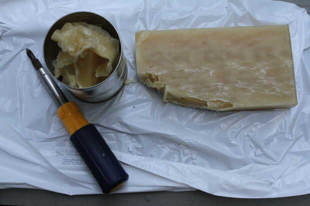 Mella en la cera sobre una superficie dura para que usted obtenga alrededor de 1/2 taza de parafina y 1/2 taza de cera de abejas. Sé que algunas personas utilizan sólo la cera de parafina para que la bolsa tiene una capa completamente clara en lugar de ligeramente amarilla, pero me encanta el olor de la cera de abejas y creo que el tinte amarillo hace que la lona encerada parezca más natural.