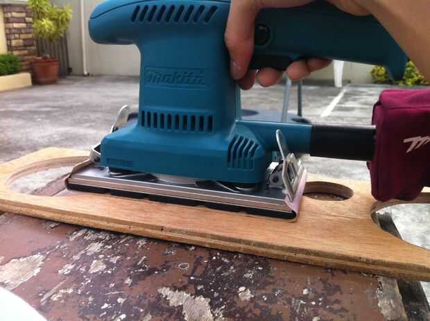 usé una lijadora eléctrica para un acabado más limpio, pero también se puede utilizar un papel de lija regular. Habrá dos sesiones lijadoras, antes de pegar el paso y el otro se hará después del paso de la madera aplicación de masilla.