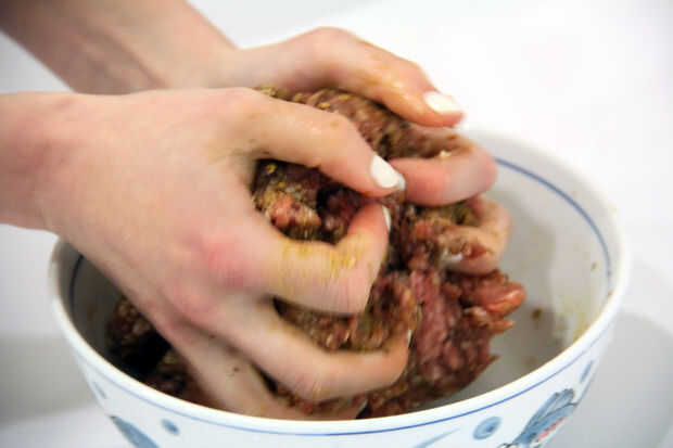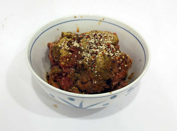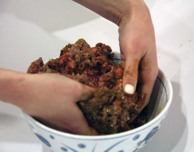 Carne de res molida marinar: poner la carne picada en un bol grande y añadir el condimento. Mezclar con las manos!!!!