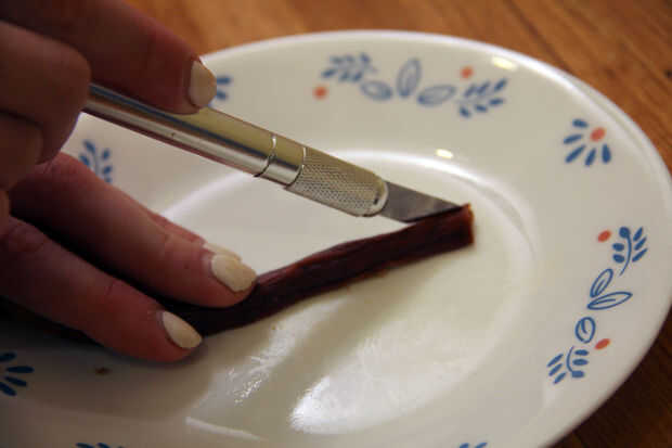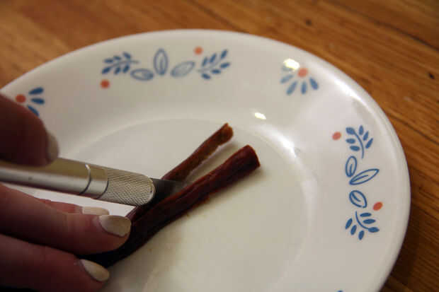 Slim Jim Lace Ups: Su realmente simple. Use un cuchillo x-acto para una slim jim de la rebanada por la mitad. Luego corte las mitades por la mitad otra vez para que tenga 1/4 espesor slim jims. El punto es mantener la longitud de la slim jims, pero disminuir el espesor.