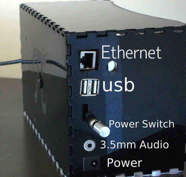 Todos los puertos de montaje como se muestra en la imagen: bajo usb la frambuesa pi Monte el interruptor de encendido y debajo de eso montar el extensor de audio de 3,5 mm en el lado. Enchufe el otro extremo de conector de audio de 3,5 mm de la frambuesa pi. Finalmente instale al conector de entrada DC bajo el extensor de audio jack de 3,5 mm.