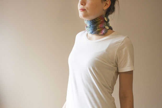 1 madeja de hilo grueso Mochi por cristal palace - o cualquier hilado abultado había adecuado para tamaño de agujas de 10-11. Calibre no es terriblemente importante, mientras cubre su cuello, eres bueno!