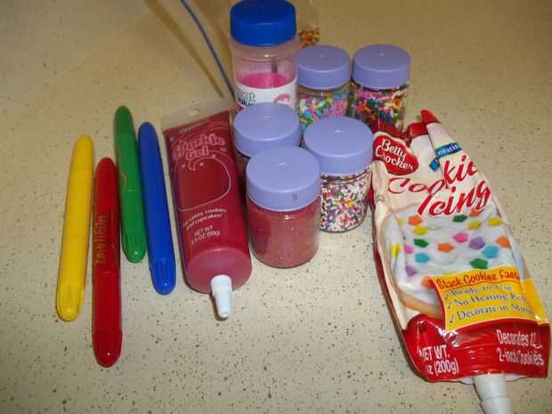 Aquí viene la mejor parte de decoración. Haz tus artículos de decoración. He usado gel de brillo, galletas, glaseado, Betty Crocker fácil escritor alimentos decoradores y chispitas de caramelo.
