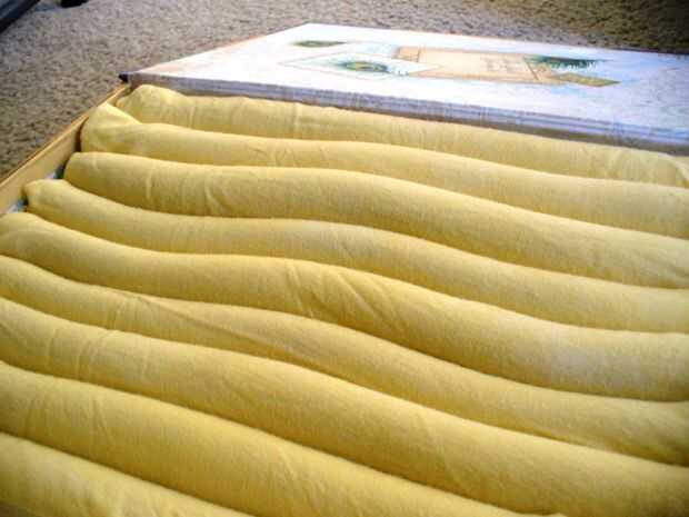Si usted utiliza un pedazo de tela (o bufanda vieja en mi caso) que es particularmente resbaladizo, o tal vez apenas cubre sus pliegues de espuma, sugiero un ligero toque de pegamento en el interior de la tela en el interior de la caja. Esto puede no ser necesario; sólo depende del tipo de tela que utilizas y caja. No duele, pero si estaban haciendo este cuadro para ti, y mi en el futuro desea para cambiar hacia fuera la tela, podría complicar las cosas.