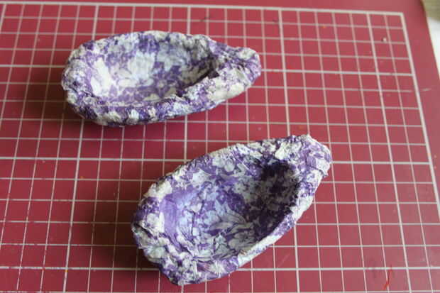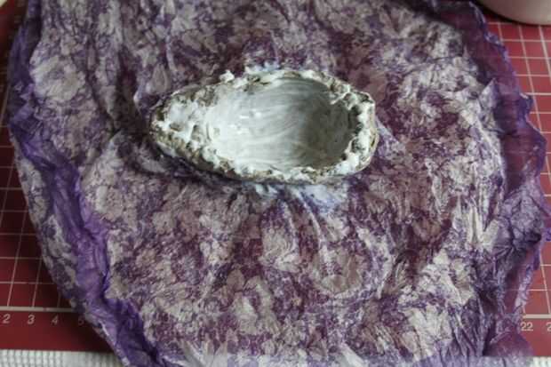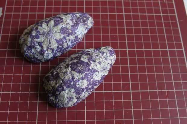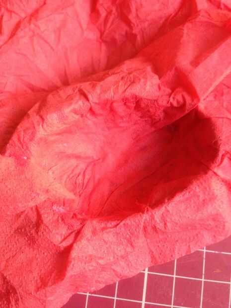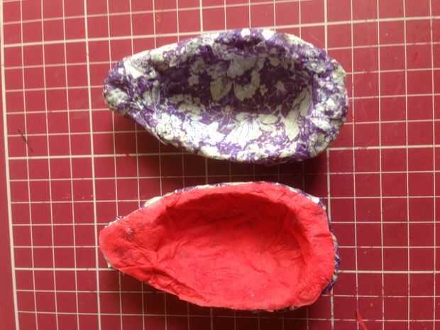 Aplique una capa de pegamento blanco y carpeta goma dentro del huevo, pega la hoja arrugada de papel de color rojo. Pegué rojo sólo a una mitad del huevo. Recortar el papel sobrante del interior del huevo.