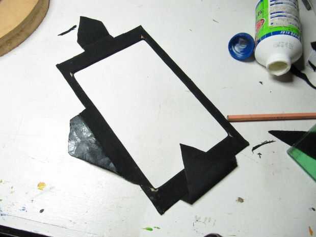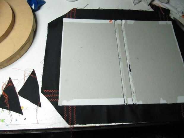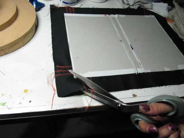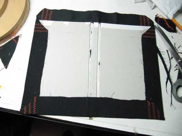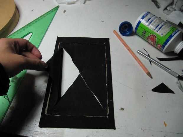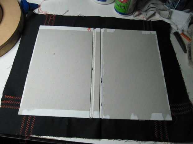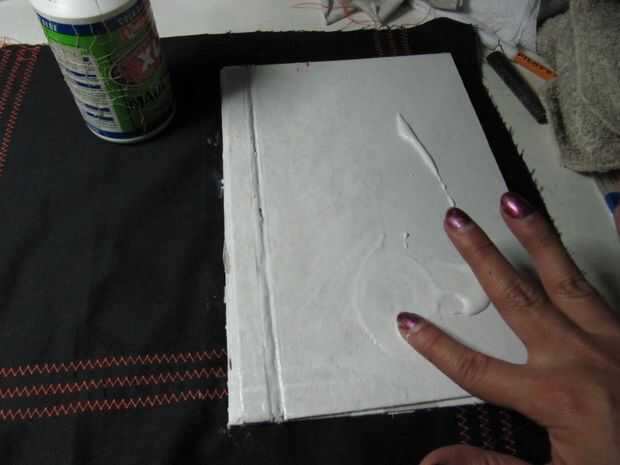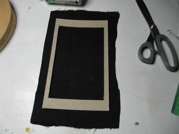Unte el pegamento en el cartón y pegar sobre la tela, la esquina de cortar y pegar el exceso sobre el otro lado de la cartulina.