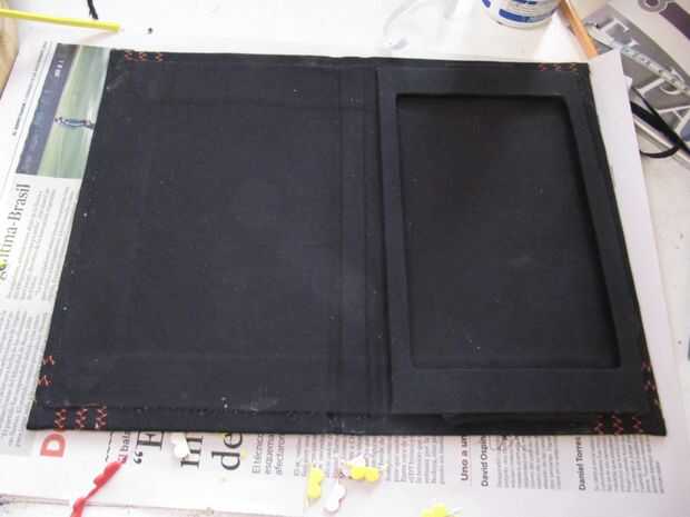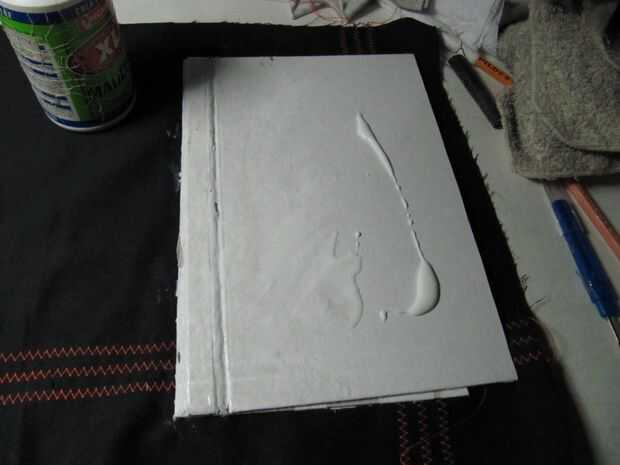 Cortar una cartulina de 12 x 21 cm del marco y cubierta para que con tela, el exceso es utilizado unir el marco con la tapa, es pegamento entre la cubierta y un trozo de tela.