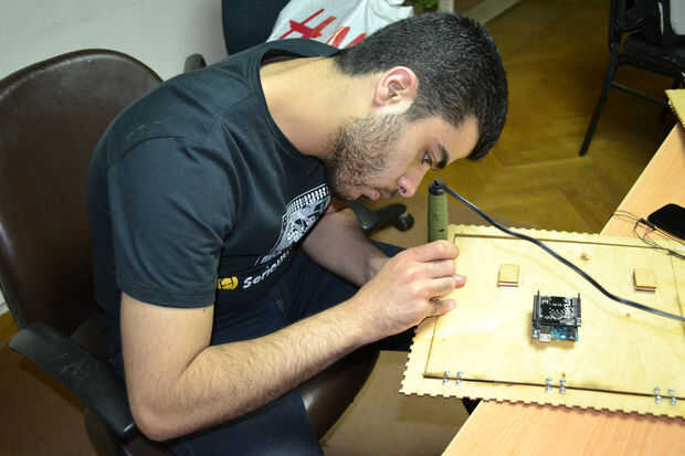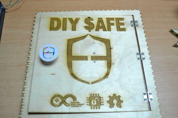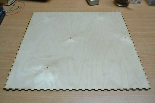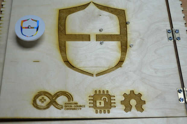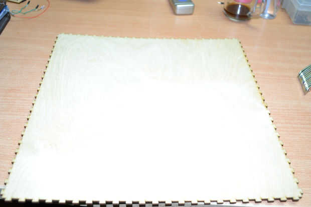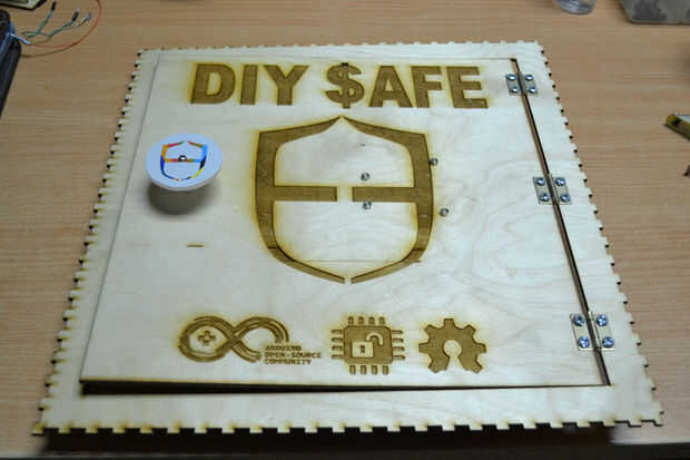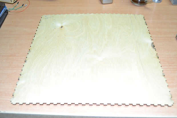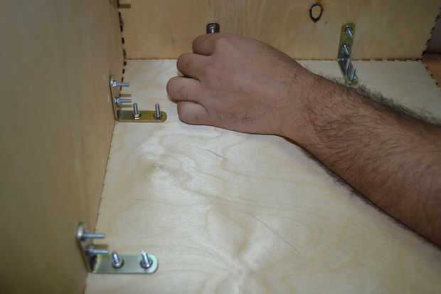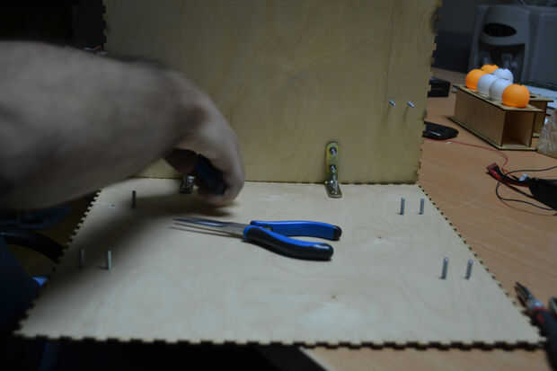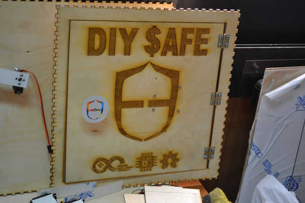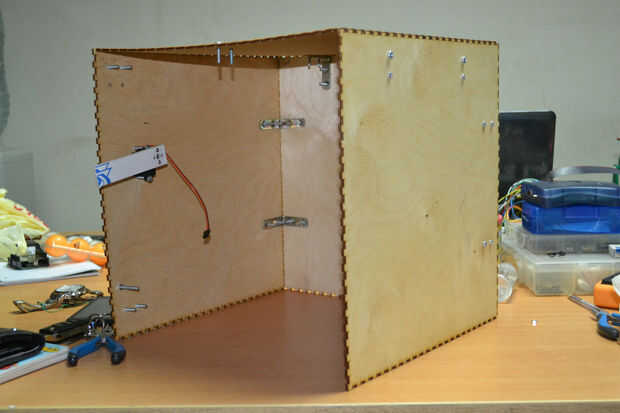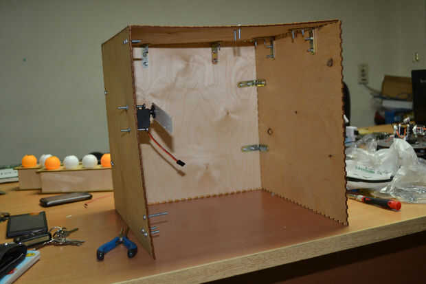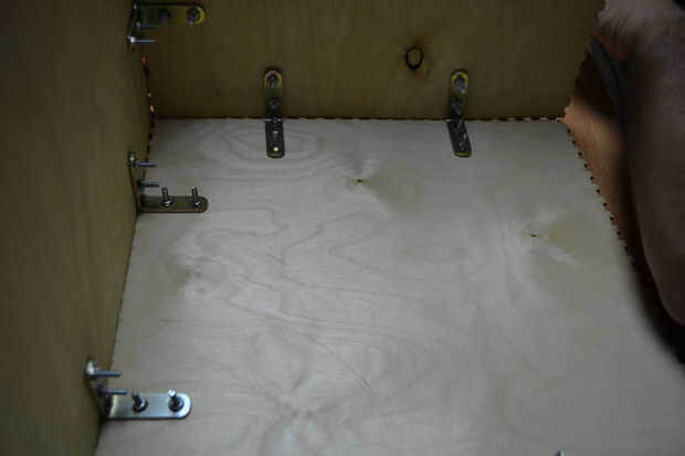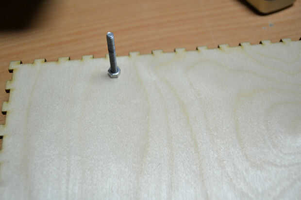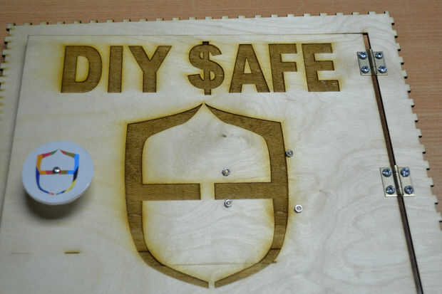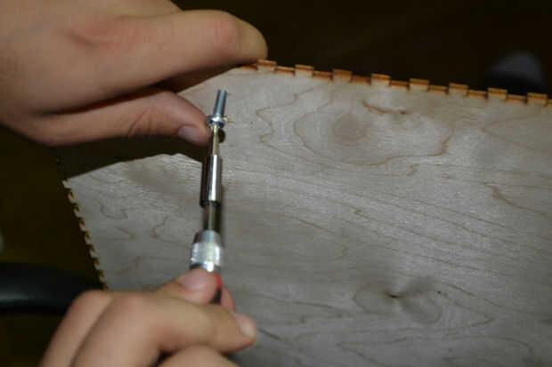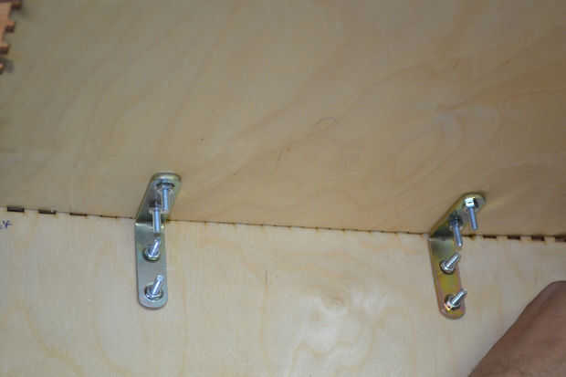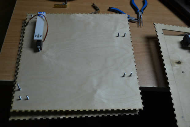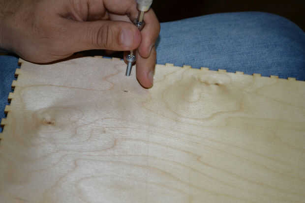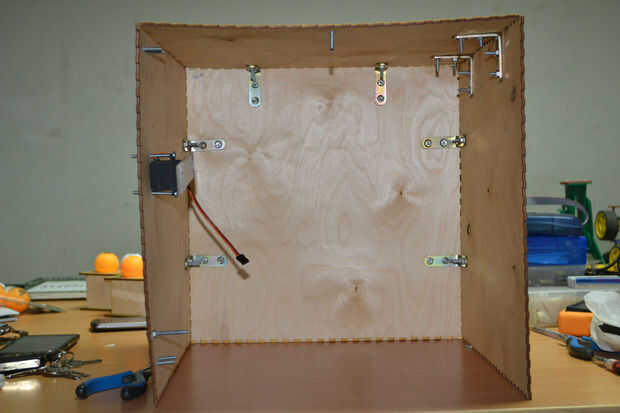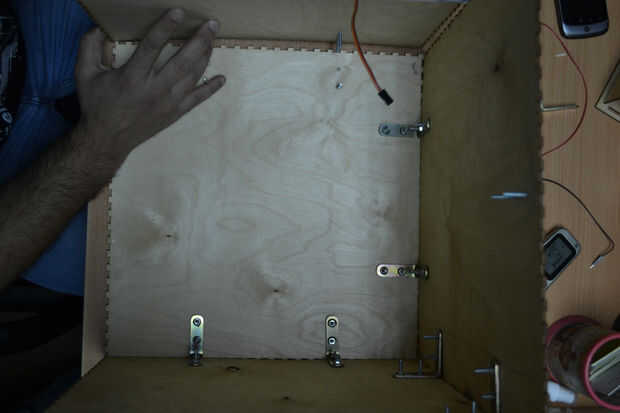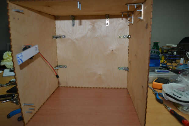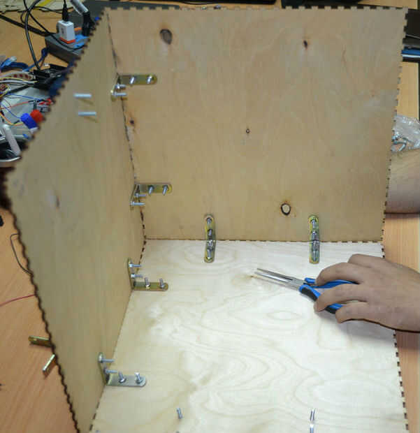 Después de cortar las hojas de madera contrachapada con el cortador del laser he encontrado que hay un problema en la instalación de los componentes de la caja debido a un error en el software de BoxMaker usé mi perforador para hacer algunos agujeros para fijar los soportes de ángulo de acero inoxidable para fijar los lados de la caja. Entonces usé 3 bisagras pequeñas para fijar la puerta de la caja fuerte.