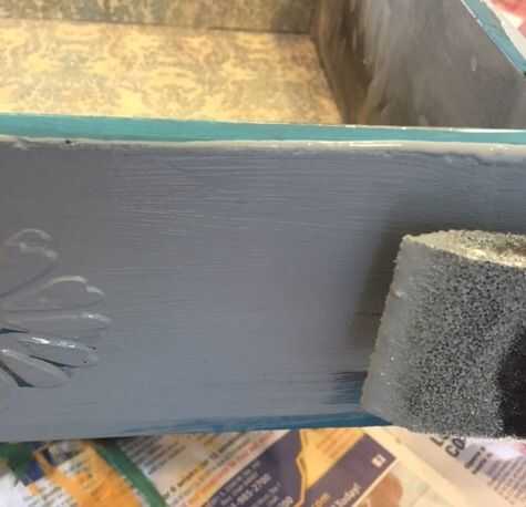 La segunda capa de pintura. Usé pintura de tiza casera porque me gusta el look liso, mate. También hice una calcomanía de madera del faux con yeso. Una vez seca la pintura, me lija otra vez a señal de socorro luego agrega un botón de Hobby Lobby. No te olvides de rociar con un polycrylic o pintura acrílica para proteger de suciedad y humedad. Recuerde, si usted rocía, hará que la pieza un poco más oscura así que planificar su pintura.