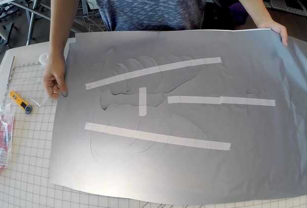 -Tome el material reflectante y su imagen a una almohadilla de corte. Colocar la imagen en la parte superior el lado reflexivo y cinta por los lados para que no se mueva mientras se corta.