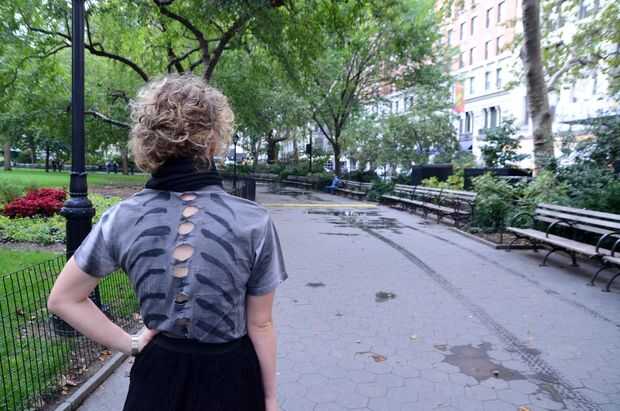 en este video, muestro chicos cómo cortar tres columnas en la parte posterior de la camiseta-dos estrechos en el lado y uno ancho en el centro. Puede optar por dejarlas como las tiras horizontales, todos ellos de la armadura o ate la tira central en