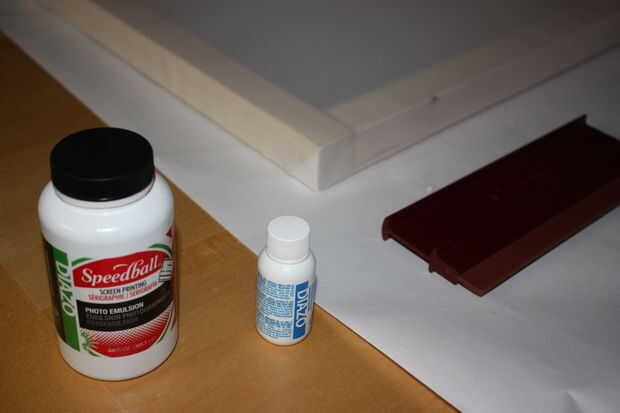 Usé emulsión foto de Speedball para crear mis pantallas. Siga las instrucciones en la botella para mezclar los dos frascos juntos para activar los químicos fotosensibles. Estos productos químicos pueden ser perjudiciales para la piel así que use guantes. Una vez bien se mezcla con la emulsión de la foto, utilice un jalador limpiaventanas para aplicar una capa lisa en sus marcos. Necesita alternativa dentro y fuera del marco para garantizar un revestimiento uniforme y liso. Esto fue un paso muy desordenado. Estaba aplicando demasiada emulsión o presionar demasiado a través de la pantalla, o ambos. Por el momento cubrió la tercera imagen me estaba empezando a tener una idea mejor de cómo aplicarlo. Asegúrese de que tener papeles o paños para proteger contra cualquier derrame.