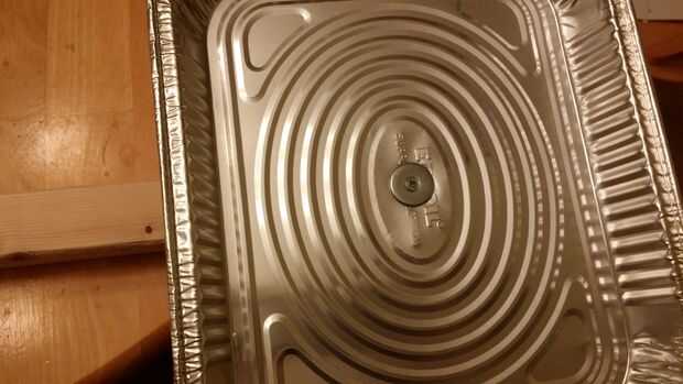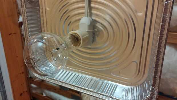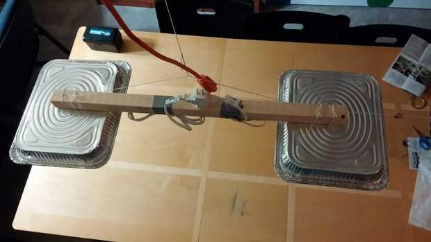 Desde que tuve dos grandes marcos que toman un tiempo para curar, quería exponerlas simultáneamente. Para ello, he construido una plataforma de doble exposición con algunos restos de madera, un par de cables de corta extensión, adaptadores bombilla y hoja cazuela cazuelas. Primero enrosca cada pan de hoja, que será mi reflectores, extremos opuestos de algunos restos de madera de tres pies de largo. Luego caliente había pegado a los cables en el centro de las cacerolas y corrió el cable hacia el centro de la madera. Que conectado a un cable de extensión de potencia utilizando un adaptador. Los adaptadores bombilla fueron enchufados los cables en el centro de cada pan de reflector. Utilizan bulbos de 150 vatios para curar la emulsión de la foto. Este aparejo entero fue suspendida encima de mi mesa de trabajo con unos cordeles resistentes. Até un lado así que ancla la plataforma y evitar que la deriva o spinning.