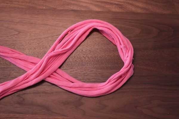 Primero separar tus tiras de la camiseta en dos paquetes de seis tiras. Tomar 1 paquete de 6 tiras y forma un lazo como se muestra.