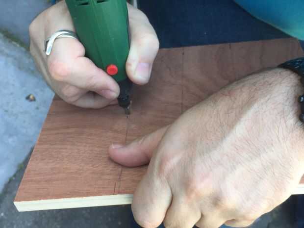 Usar la Dremel con una broca para hacer dos ranuras en el tablero de múltiplex para la venda de las correas pasar a través