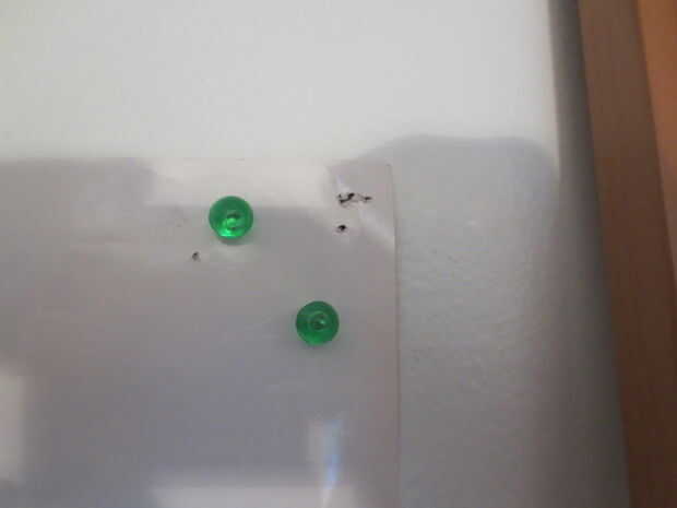 Este cartel funciona como un tablero de borrado en seco para que pueda utilizar sus seco borra marcadores en él también. Puede tomar un poco de trabajo para limpiarla, sin embargo. Generalmente una toalla de papel húmeda seguida de una toalla de papel seca hace el truco.
