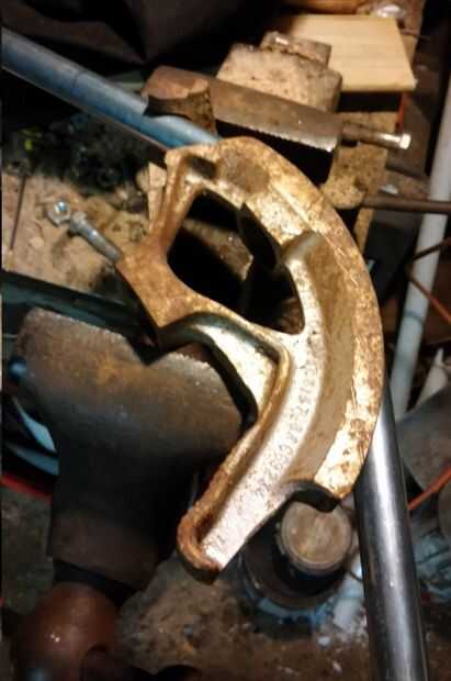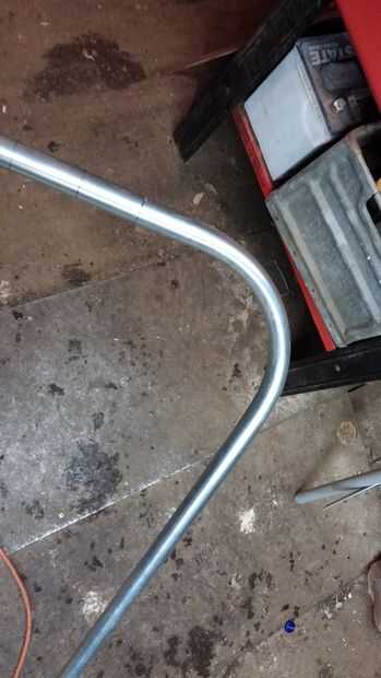 Para el manillar, elegí un 10' longitud 3/4 conducto de cables eléctricos. Conducto es significativamente más rígido de pvc (lección aprendida), pero es aún ligera. 3/4" conduit doblez herramienta debe usarse, pero sólo tenía 1" doblar la herramienta, que montara en un tornillo de banco, porque la herramienta no tenía un mango. Para lograr un 18" difundir, encontré y había marcado el centro de mi longitud de conducto de 3/4", midiendo 5' en ambos extremos. Me salió y marcó 2-1/4" de la izquierda y derecha de la marca, que he utilizado para alinear el conducto con la posición inicial de la herramienta de doblez. Las curvas son ambos 90 grados.