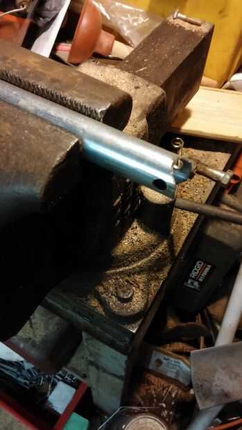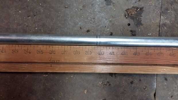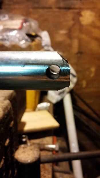 Estoy 5' 10" alto, por lo que para mí, una altura de manillar de unos 40" sentido a gusto. Usé otro pedazo de tubo para alinear la regla, que aseguró que tenía una hasta 40" en cada lado. Una vez cortada a la altura deseada, siga adelante y perfore agujeros de 5/16" para ajustar los pernos de cerradura de alambre de 1/4". Luego con un hack vio archivo, cortar las puntas de rincón de los extremos del poste y archívelas suave. Esto es que permite el manillar girar como los rieles de la flexión sobre un terreno desigual. También ayuda a evitar que el manillar que revienta los casquillos del poste, ya que por el momento, el manillar sólo funcionan como una gran barra de palanca en las tomas.