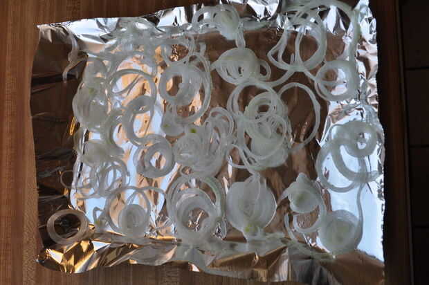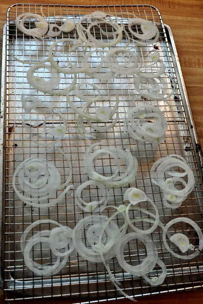 Difundir sus rodajas de cebolla super delgada en el estante de secado no tratando de capa de las rebanadas.  Luego coloque la rejilla sobre la bandeja para hornear y poner en el horno.  Ahora es tiempo de buscar algo más que hacer para las próximas 3-4 horas.  Oye nunca dije que sería más rápido que ir a la tienda.  Si vas a navegar por la red y no desea establecer un temporizador que se puede hacer clic aquí para mi favorito temporizador en línea fijado ya para usted.