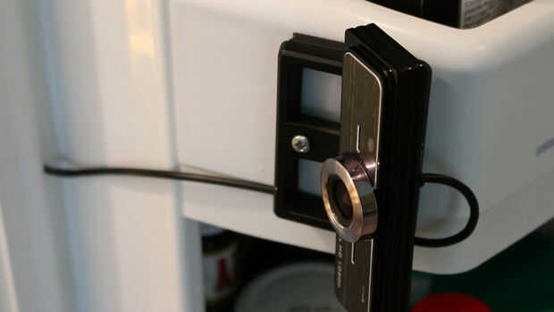 Pude rellenar mi cable USB detrás de la tira magnética del refrigerador que hicieron cosas agradable y limpio. Taladré un agujero de tornillo pequeño para montar la cámara.
