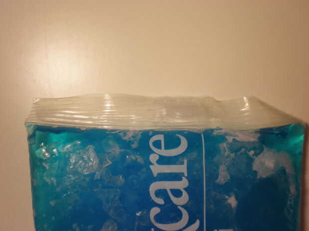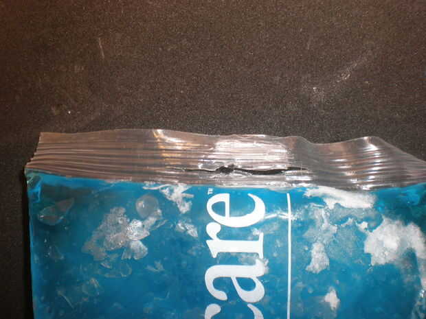 Corte dos ranuras, una en cada lado del paquete de hielo. La ranura debe tener el mismo ancho de la correa.