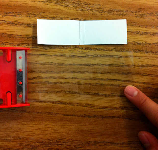 2. saque suficiente cinta para cubrir el lado estampado del papel de cartulina.