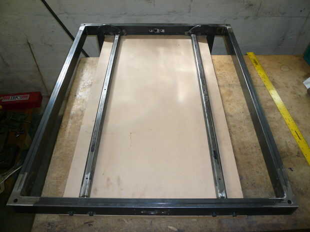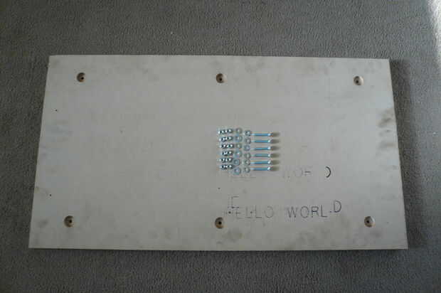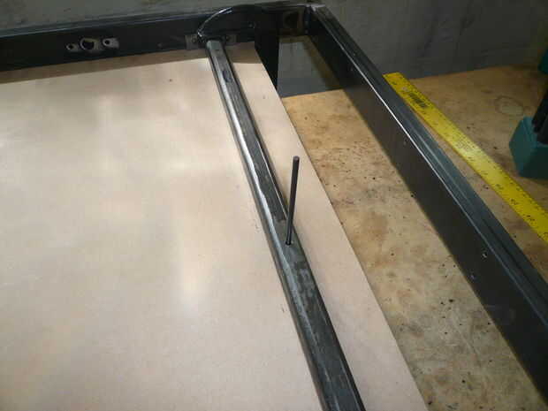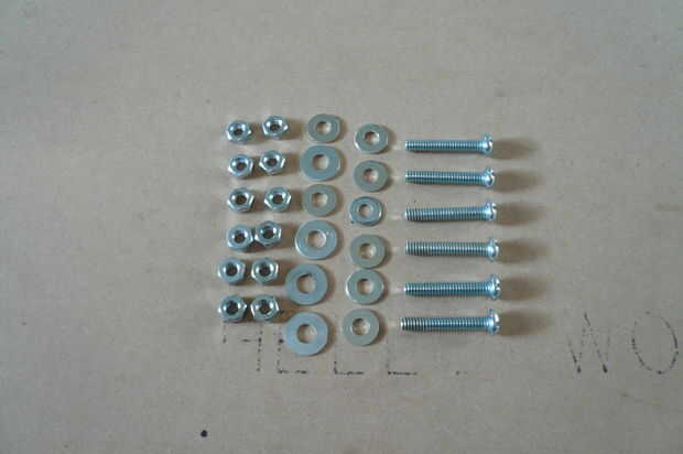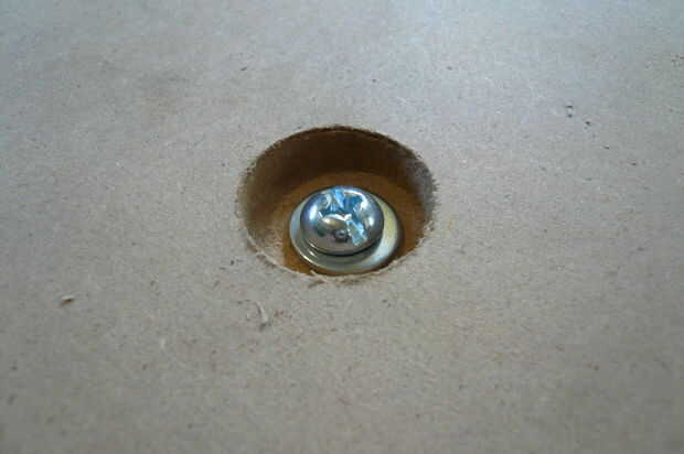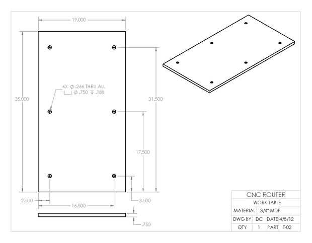 La mesa de trabajo es una pieza de MDF de 3/4" y se fija con pernos a las barras de soporte de mesa. Esto es la superficie que el material se sujeta a. Opté por usar MDF para este propósito ya que será una pieza sacrificial y puede reemplazarse barato cuando sea necesario. Se atornilla abajo trabajo a esto y puede cortar en él si es necesario. El hardware en el cuadro es de 1/4"- 20 x 1,5" largo tornillos, tuercas y arandelas. Los tornillos deben ser completamente enrroscadas. Los seis tornillos que se utilizan para montaje y nivel de la mesa de trabajo a la máquina. El contador aburridos agujeros permiten a las cabezas de los tornillos a sentarse debajo de la superficie de la mesa para que el material puede fijarse fácilmente.