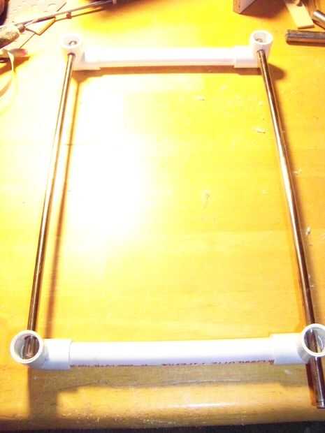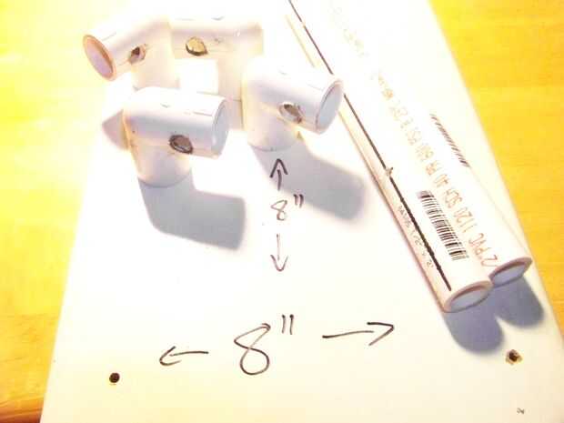 Cortar dos tubos de PVC de 8 1/4". En el codo hay será un pliegue, un lápiz marque. Medida 3/4" de la parte superior y tendrá su punto central. Perforaciones en codo de PVC. Los orificios deben ser del mismo tamaño de su eje.