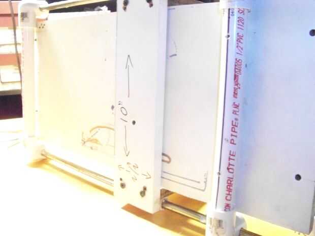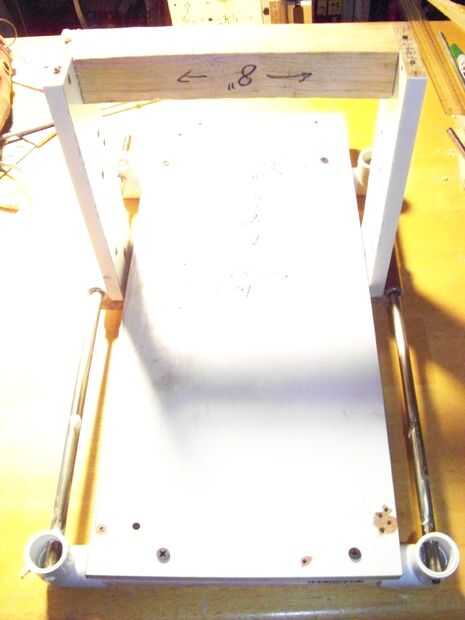 La tabla es 8 x 7 3/4". Atornillar la tabla a la tubería de PVC. Asegúrese de que todo es cuadrado. No pegar tubos de PVC juntos todavía. Asegúrese de que todo se desliza libremente. Que tenga que ajustarlo.