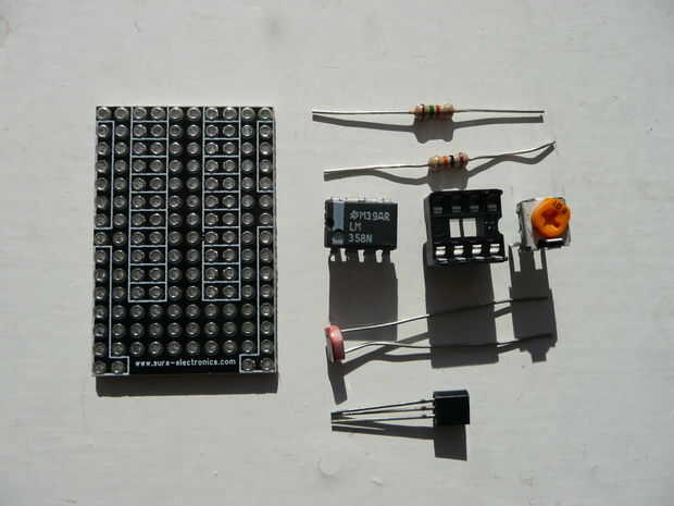 - Un zócalo DIP de 8 pines para el OpAmp. Esto no es estrictamente necesario, pero es recomendado