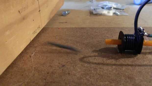 Cargar el proyectil en la paja y presione el botón. Corriente que surge en la bobina y va a tirar la uña fuera de la paja en un buen clip!