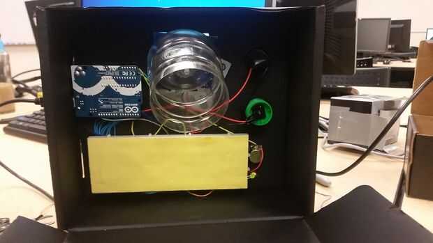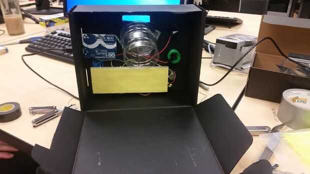 Para nuestros propósitos utilizamos una caja de cartón para albergar todo el hardware. Medida tamaño apropiado agujeros para cada uno de los componentes que usted necesita tener acceso a (ver cuadro en la introducción), asegurándose de que también hay un agujero en el lateral para conectar el cable de alimentación a la Arduino. Para Arduino y protoboard, utilizamos Velcro para fijar en el interior de la caja de modo que fácilmente podría ser quitados y vuelto a montar. Tenga en cuenta que necesitas algo para apoyar la rejilla de Adafruit cuando se presiona el botón, en este caso hemos utilizado un corte en media botella de agua pero puede utilizarse prácticamente cualquier objeto resistente.