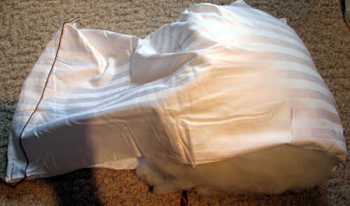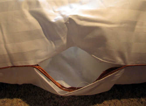 También, si tu almohada tiene recortar como mío, y desea volver a colocar, ahora sería un buen momento para pin de nuevo a un lado de la piel de la almohada y coser en su lugar. No creo que esto hasta más tarde, y este paso le ahorrará la molestia de tratar de pin y coser tres capas juntos todos a la vez mientras que bajo la presión del relleno. Honestamente, yo sugeriría sólo corte la moldura de este lado y coser las esquinas de la almohadilla hacia abajo bien en los cortes (nadie se va a ver que y idealmente debe poner todo en una funda de almohada de tamaño king mientras está en uso de todos modos!)