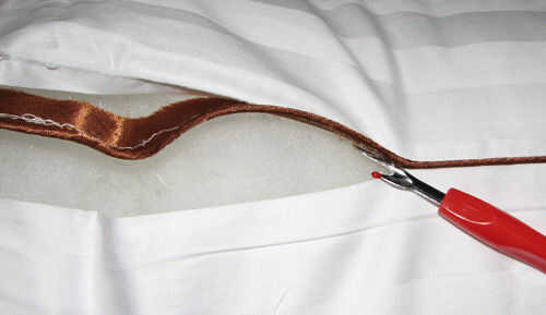 * Podría probablemente abrir la costura entera, quitar el relleno como una sola pieza y cortar por la mitad. Yo lo hice en la forma que describí anteriormente porque: