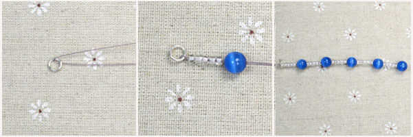 3ª, granos de la semilla 5 hilo de rosca y un gato ojo grano uno por uno en orden sobre el alambre doblado.