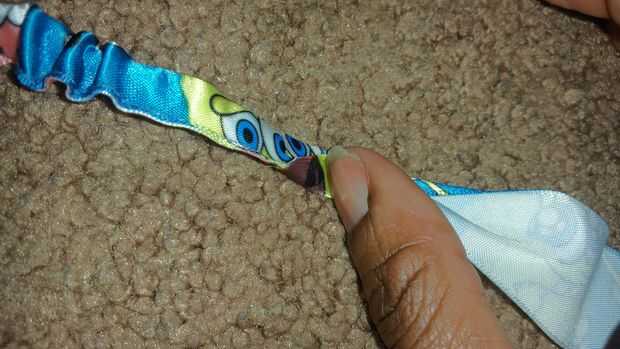 Subract que a partir de la circunferencia de su cabeza. Cortar el elástico a esa longitud. Para la segunda franja añadir en 4 a la longitud de su elástica. Doble la segunda tira en dos y stich hacia abajo.