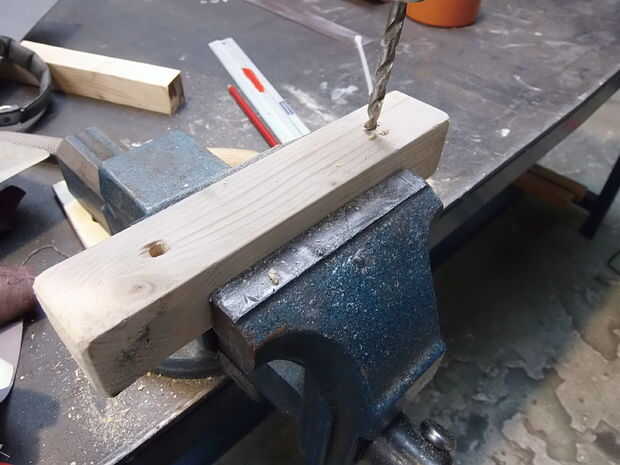 Taladre agujeros diámetro 5 mm, 3 cm de cada extremo de la madera.