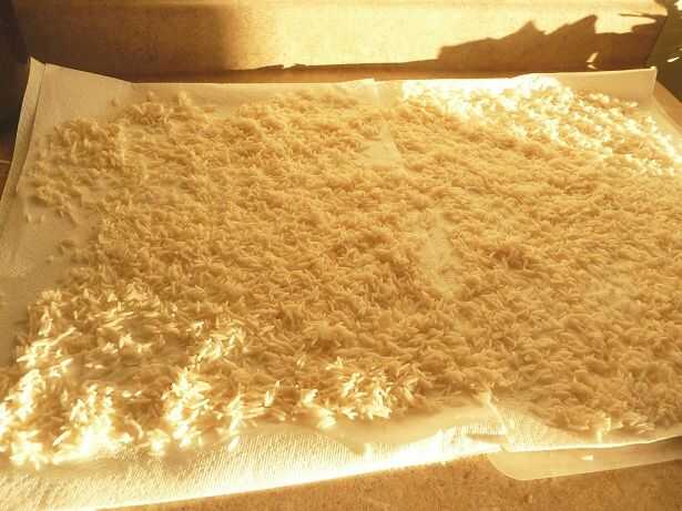 Paso 2: escurrir el arroz en un colador de malla fina de 10-15 minutos. Extiende el arroz en una triple capa de papel de cocina secar durante una hora o así. El arroz debe ser... solo un poco húmedo no mojado.