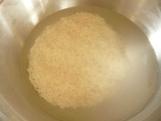 Paso 1: Enjuague el arroz completamente con agua fría. Drenaje brevemente. Poner el arroz en un bol y cubrir con agua fría. Reposar (mínimo) de 3 a 6 horas (máximos).