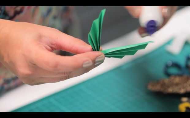 Tomar las plazas verdes y cortarlos diagonalmente por la mitad para hacer 2 triángulos. Una vez hecho eso, empezar a doblar los triángulos exactamente igual que las mariposas pero esta vez, a partir de la parte más ancha, en el mismo estilo acordeón. Al llegar al final, doblar por la mitad, manteniendo juntos los extremos más ancho y pegado junto para formar un patrón de hoja como se muestra a continuación. Hacer 3 hojas más del mismo color y evitar que a un lado.